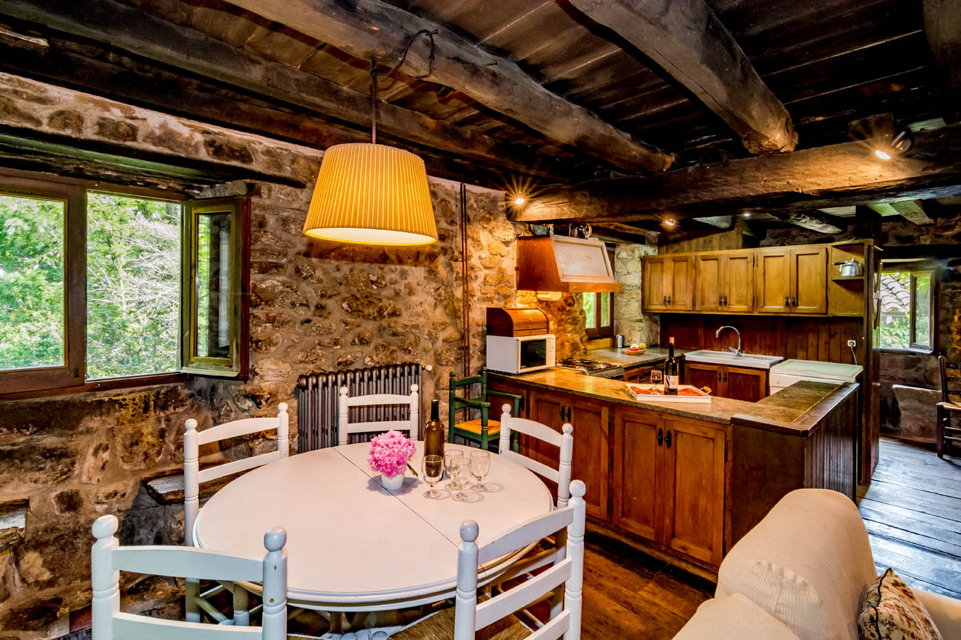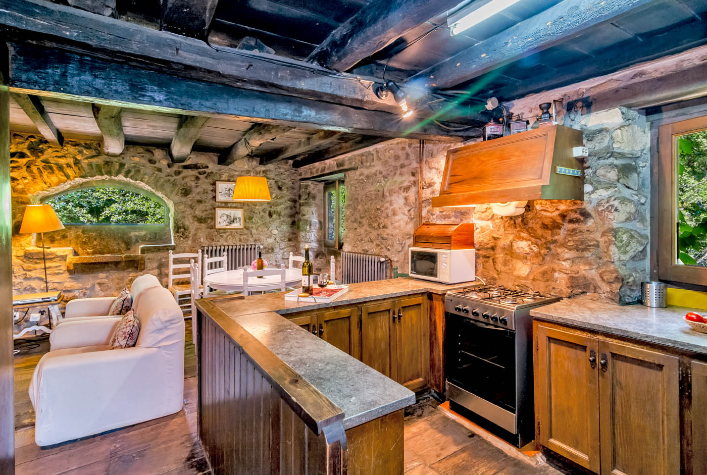 The main entrance leads directly into a lovely rustic kitchen and living quarters: a stone-walled, wood-beamed living and dining room. It accommodates four people comfortably and extra chairs can be provided to allow everyone to eat together if one or more of you is staying in the casita bedroom.